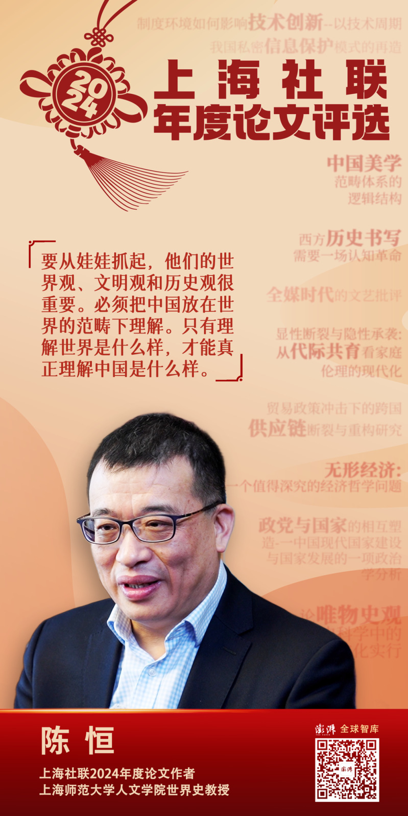 在上海社联2024年度论文《西方历史书写需要一场认知革命》(原载于《历史研究》2024年第4期)中,陈恒指出,以西方为中心的历史书写模式使得非西方国家失去了平等、公平、公正地表达观点的机会。