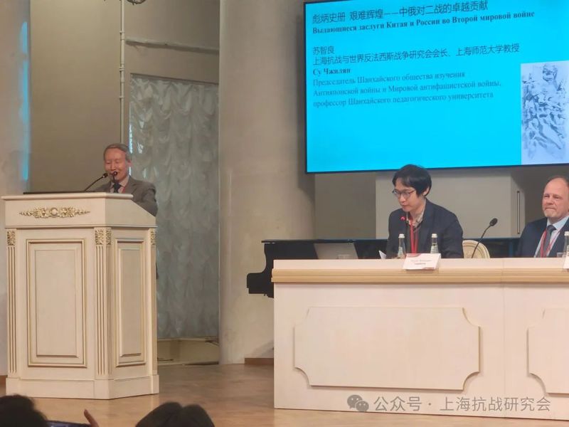 中心主任、上海抗战与世界反法西斯战争研究会会长、上海师范大学苏智良教授代表中方作大会主旨发言,报告题目为《彪炳史册,艰难辉煌——中俄对二战的卓越贡献》。苏教授指出,在第二次世界大战中,欧洲的苏德战场和亚洲的中国战场承担着抵抗德国法西斯主义和日本军国主义侵略的主要使命,战争最为惨烈,牺牲特别严重。中俄两国人民为赢得战争的最后胜利,付出了巨大的民族牺牲,是世界反法西斯战争的两大支柱。在随后发言中,苏教授分别从苏联对二战的贡献、中国对二战的贡献、中苏合作对二战的作用等三个方面详细阐明了中俄两国患难与共、并肩作战、相互支援的历史进程和伟大意义。苏教授最后总结道,中俄携手并肩战胜日本法西斯的共同历史经历,是今天中俄两国“全面战略协作伙伴关系”深厚历史基础的重要组成部分,有助于两国以史为鉴,促进世界和平发展。