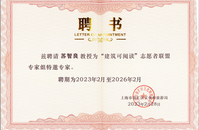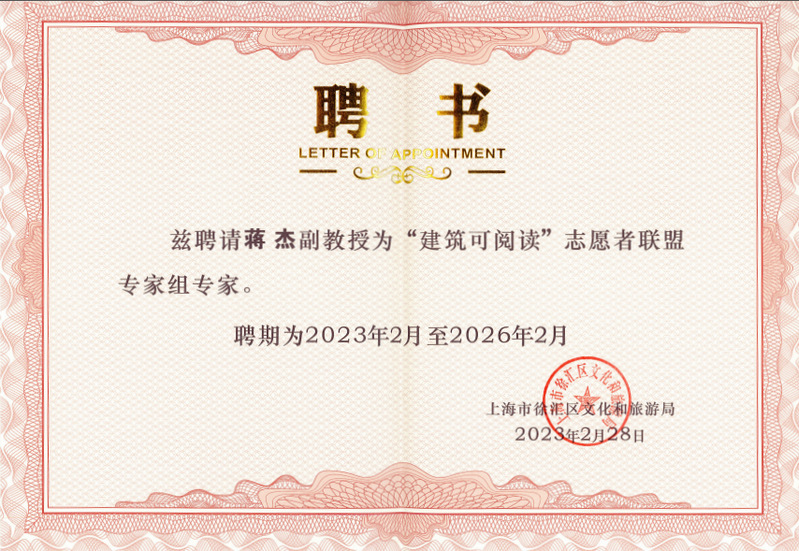 2023年2月28日,徐家汇书院举行“‘建筑可阅读’志愿者联盟专家组成立暨聘任仪式”,上海市文旅局李晶处长、徐汇区文旅局二级调研员范郴等出席仪式并为专家们颁发聘书。聘任仪式上,上海师范大学都市文化研究中心主任苏智良教授被聘为专家组特邀专家,中心研究员蒋杰副教授被聘为专家组专家。