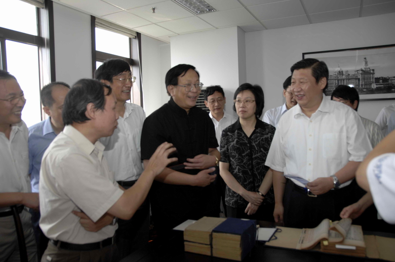 习近平、殷一璀、丁薛祥、杨定华等来到位于文苑楼十三楼的上海都市文化E研究院和上海师大都市文化研究中心参观考察。饶有兴致地听了非洲问题专家、人文学院教授舒运国为上海世博会非洲馆做的场馆规划介绍。在上海师大都市文化研究中心,习近平兴致勃勃地拿起放大镜,仔细看了中心收藏的陈寅恪亲笔手批的《白氏长庆集》和王国维亲笔手校的《一切经音义》,随后翻看了一些中心的研究成果。习近平说,海派文化要很好地挖掘一下,古为今用,研究如何在传承的基础上创新和打造上海大众文化大都市的内涵。